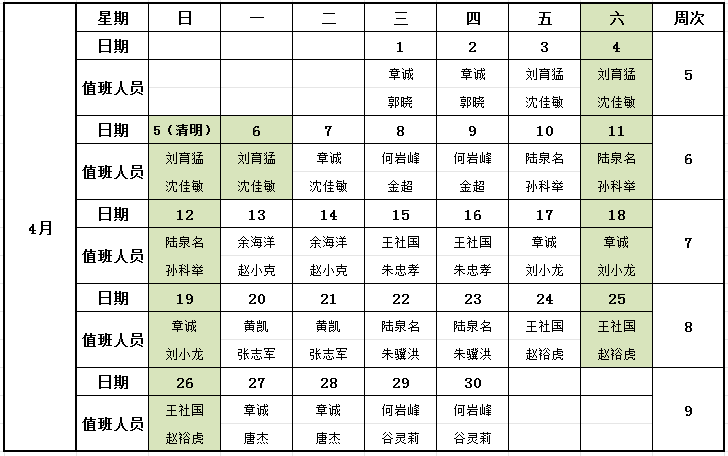 2026年4月值班安排