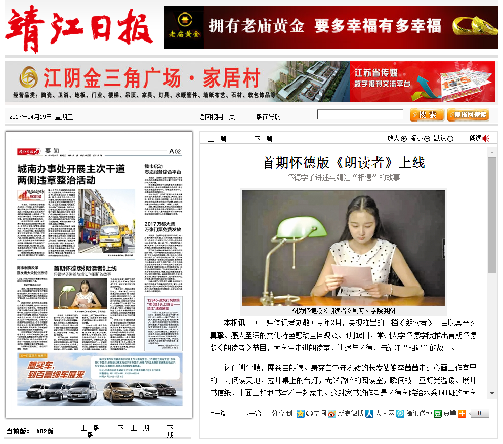 本报讯 (全媒体记者刘敏)今年2月,央视推出的一档《朗读者》节目以其平实真挚、感人至深的文化特色感动全国观众。4月16日,常州大学怀德学院推出首期怀德版《朗读者》节目,大学生走进朗读室,讲述与怀德、与靖江“相遇”的故事。
