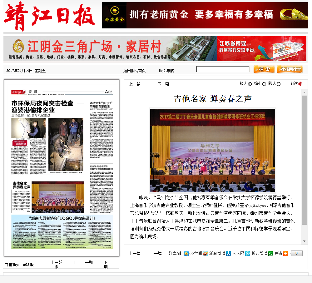 昨晚,“马洲之夜”全国吉他名家春季音乐会在常州大学怀德学院润德堂举行。上海音乐学院吉他专业教授、硕士生导师叶登民,俄罗斯基洛夫Matyaev国际吉他音乐节总监格里戈里·诺维科夫,新锐女性古典吉他演奏家陈曦,泰州市吉他学会会长、丁丁音乐联合创始人丁吴洪和在我市参加全国第二届儿童吉他创新教学研修班的吉他培训师们为观众带来一场精彩的吉他演奏音乐会。近千位市民和怀德学子观看演出。图为演出现场。
