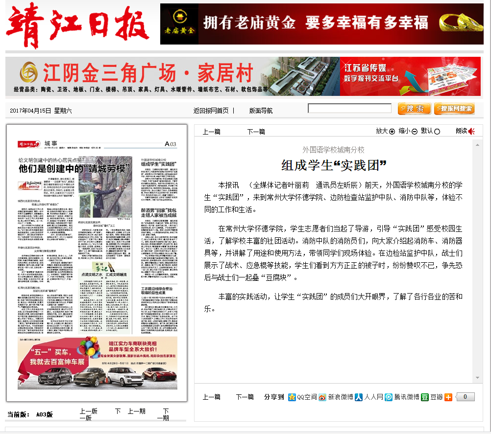 本报讯 (全媒体记者叶丽莉 通讯员左昕辰)前天,外国语学校城南分校的学生“实践团”,来到常州大学怀德学院、边防检查站监护中队、消防中队等,体验不同的工作和生活。