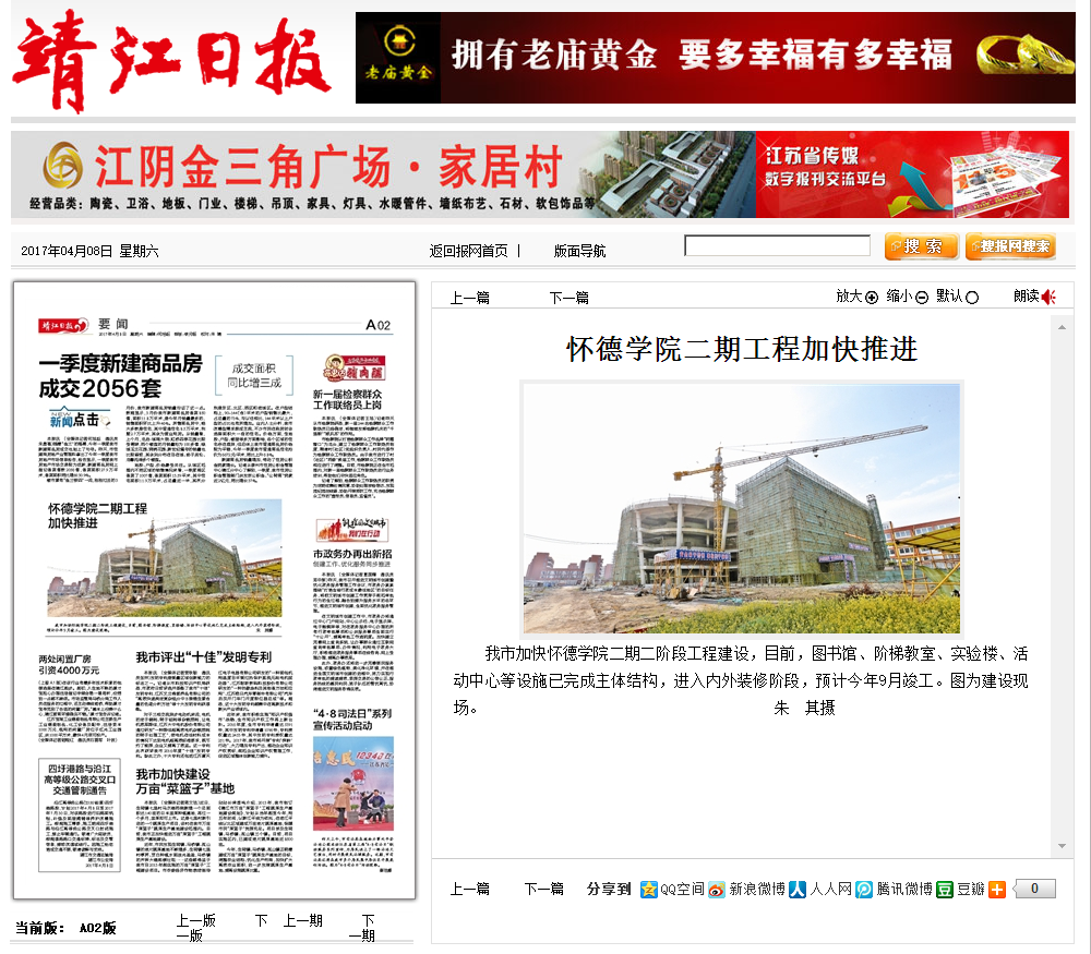 我市加快怀德学院二期二阶段工程建设,目前,图书馆、阶梯教室、实验楼、活动中心等设施已完成主体结构,进入内外装修阶段,预计今年9月竣工。图为建设现场。