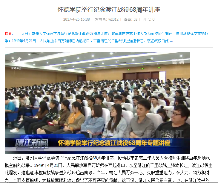 近日,常州大学怀德学院举行纪念渡江战役68周年讲座,邀请我市史志工作人员为全校师生细述当年那场规模空前的战争。1949年4月21日,人民解放军百万雄师在西起湖口、东至靖江的千里战线上强渡长江,渡江战役由此爆发,这也意味着解放战争进入战略追击阶段。当年,靖江人民万众一心,克服重重阻力,在人力、物力和财力上全面支援前线,为解放军顺利渡江做出了不可磨灭的贡献,这不仅让靖江人民倍感自豪,也让在靖江读书的怀德学子深受鼓舞。