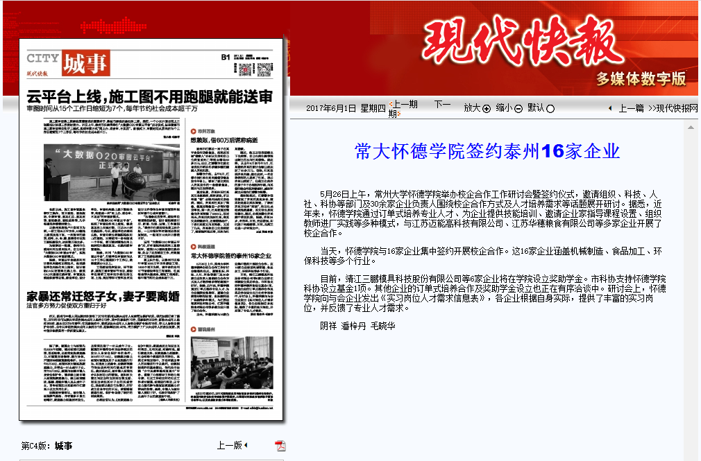 5月26日上午,常州大学怀德学院举办校企合作工作研讨会暨签约仪式,邀请组织、科技、人社、科协等部门及30余家企业负责人围绕校企合作方式及人才培养需求等话题展开研讨。据悉,近年来,怀德学院通过订单式培养专业人才、为企业提供技能培训、邀请企业家指导课程设置、组织教师进厂实践等多种模式,与江苏迈能高科技有限公司、江苏华穗粮食有限公司等多家企业开展了校企合作。