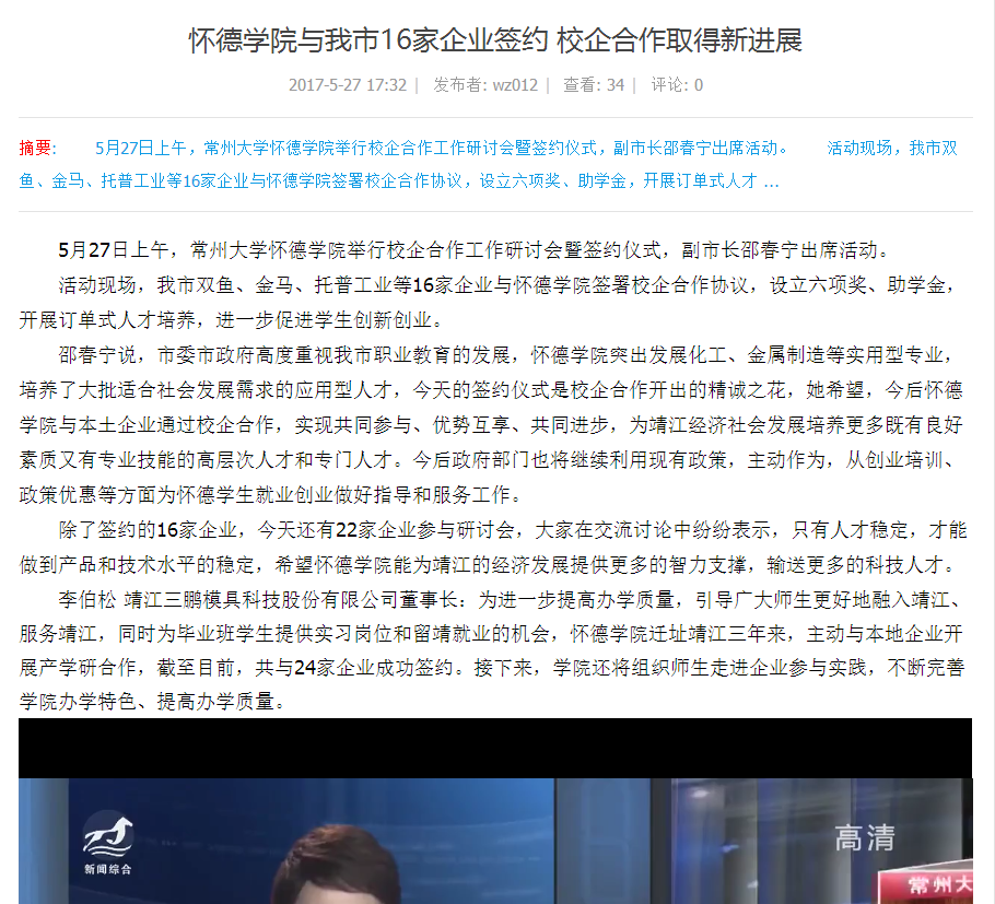 李伯松 靖江三鹏模具科技股份有限公司董事长:为进一步提高办学质量,引导广大师生更好地融入靖江、服务靖江,同时为毕业班学生提供实习岗位和留靖就业的机会,怀德学院迁址靖江三年来,主动与本地企业开展产学研合作,截至目前,共与24家企业成功签约。接下来,学院还将组织师生走进企业参与实践,不断完善学院办学特色、提高办学质量。