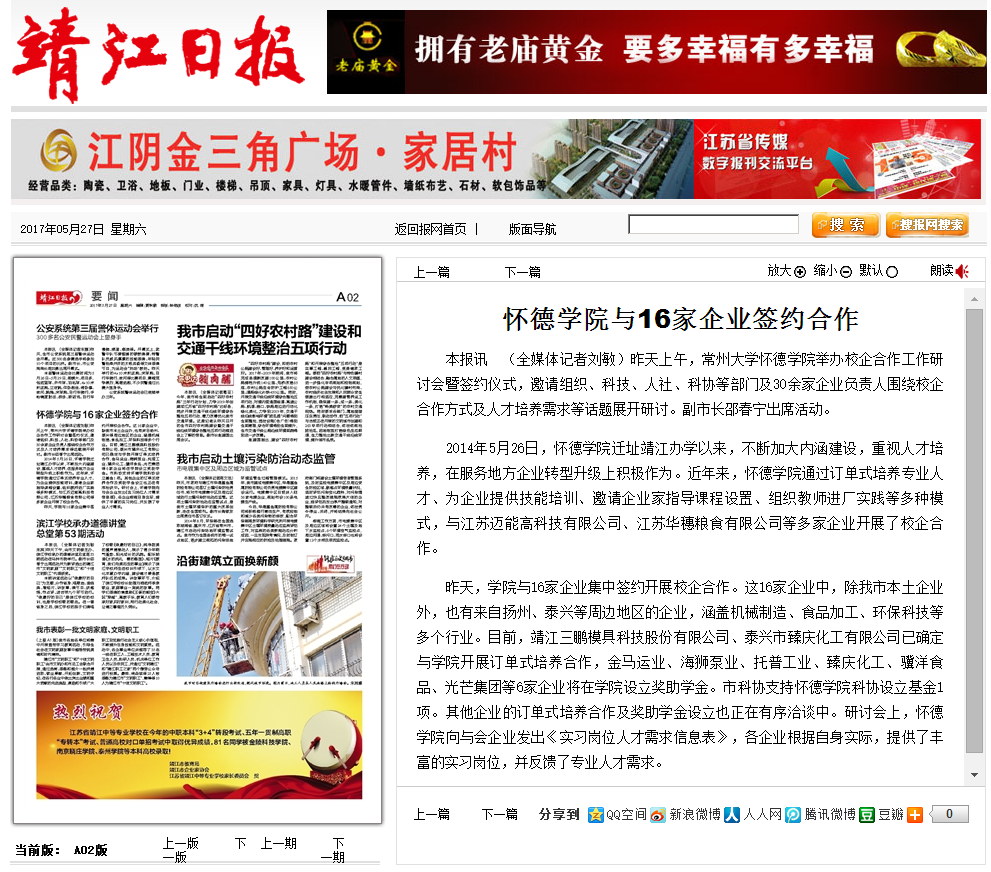 2014年5月26日,怀德学院迁址靖江办学以来,不断加大内涵建设,重视人才培养,在服务地方企业转型升级上积极作为。近年来,怀德学院通过订单式培养专业人才、为企业提供技能培训、邀请企业家指导课程设置、组织教师进厂实践等多种模式,与江苏迈能高科技有限公司、江苏华穗粮食有限公司等多家企业开展了校企合作。