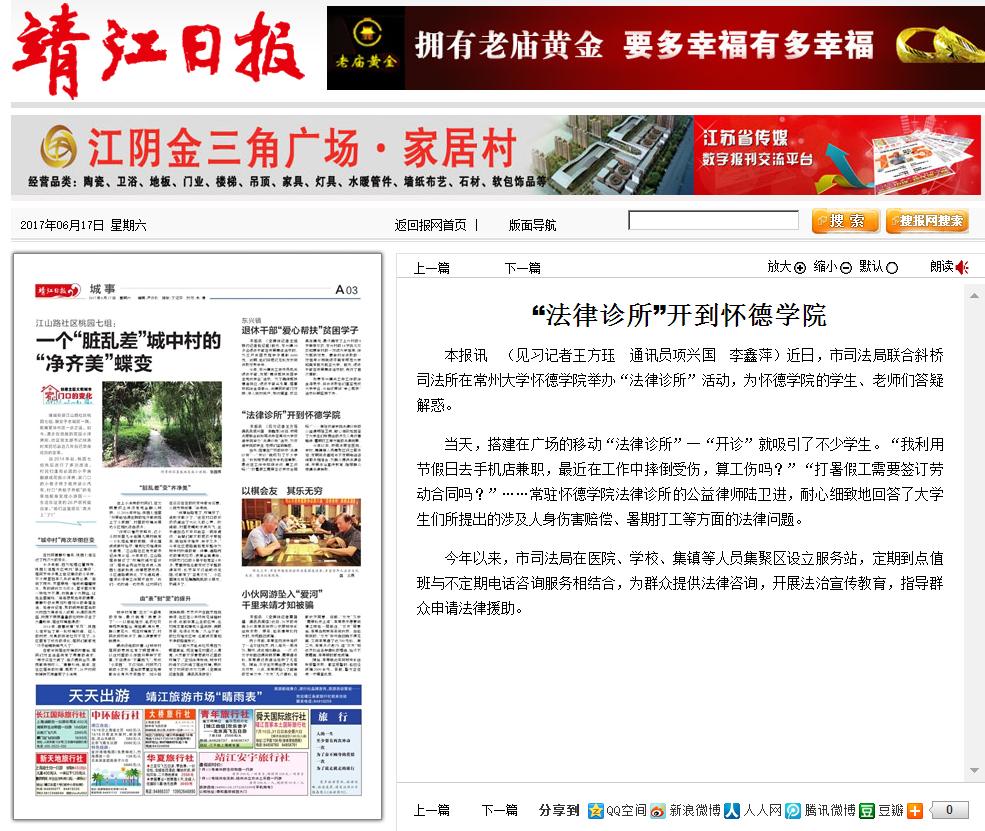 本报讯 (见习记者王方珏 通讯员项兴国 李鑫萍)近日,市司法局联合斜桥司法所在常州大学怀德学院举办“法律诊所”活动,为怀德学院的学生、老师们答疑解惑。