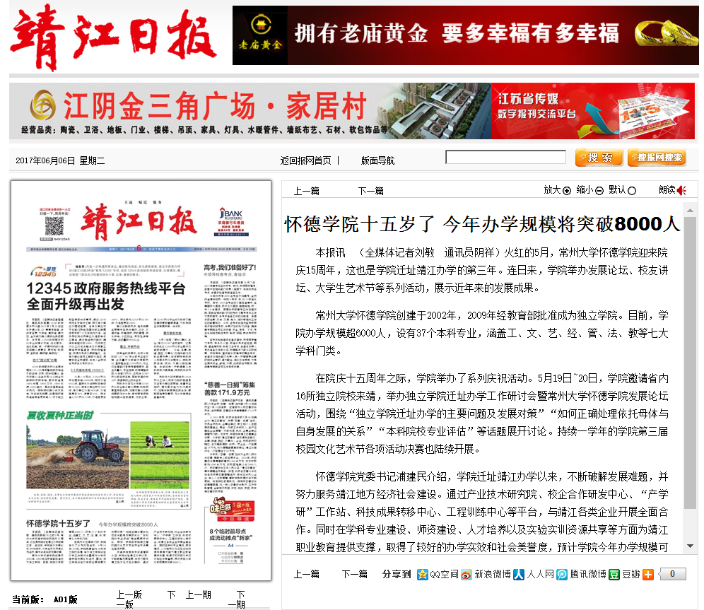 怀德学院党委书记浦建民介绍,学院迁址靖江办学以来,不断破解发展难题,并努力服务靖江地方经济社会建设。通过产业技术研究院、校企合作研发中心、“产学研”工作站、科技成果转移中心、工程训练中心等平台,与靖江各类企业开展全面合作。同时在学科专业建设、师资建设、人才培养以及实验实训资源共享等方面为靖江职业教育提供支撑,取得了较好的办学实效和社会美誉度,预计学院今年办学规模可突破8000人。
