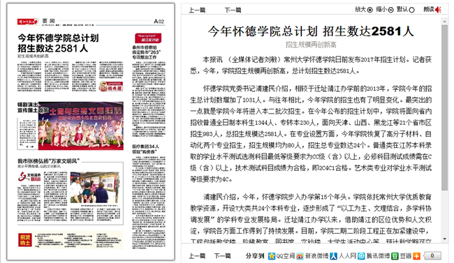 本报讯 (全媒体记者刘敏)常州大学怀德学院日前发布2017年招生计划。记者获悉,今年,学院招生规模再创新高,总计划招生数达2581人。