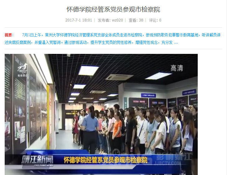 7月1日上午,常州大学怀德学院经济管理系党支部全体成员走进市检察院,参观预防职务犯罪警示教育基地,听讲解员讲述贪腐反腐案例,并重温入党誓词。通过参观活动,提升学生党员的党性修养,增强党性观念,充分发挥全系学生党员“学在先、走在前”的模范带头作用。