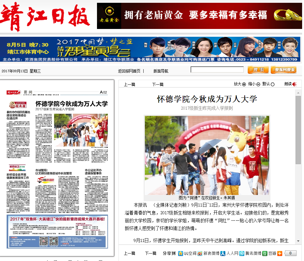 本报讯 (全媒体记者刘敏)9月11日~12日,常州大学怀德学院校园内,到处洋溢着青春的气息,2017级新生相继来校报到,开启大学生活。迎接他们的,是宽敞秀丽的大学校园,亲切的学长学姐,萌萌的怀德“网红”……贴心的入学引导让每一名新怀德人感受到了怀德和靖江的热情。