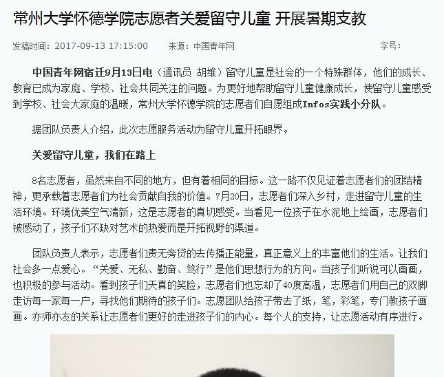中国青年网宿迁9月13日电(通讯员 胡维)留守儿童是社会的一个特殊群体,他们的成长、教育已成为家庭、学校、社会共同关注的问题。为更好地帮助留守儿童健康成长,使留守儿童感受到学校、社会大家庭的温暖,常州大学怀德学院的志愿者们自愿组成Infos实践小分队。