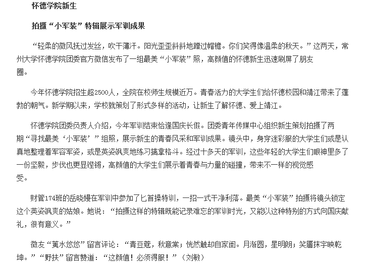 “轻柔的微风抚过发丝,吹干薄汗。阳光歪歪斜斜地蹭过帽檐。你们笑得像温柔的秋天。”这两天,常州大学怀德学院团委官方微信发布了一组最美“小军装”照,高颜值的怀德新生迅速刷屏了朋友圈。