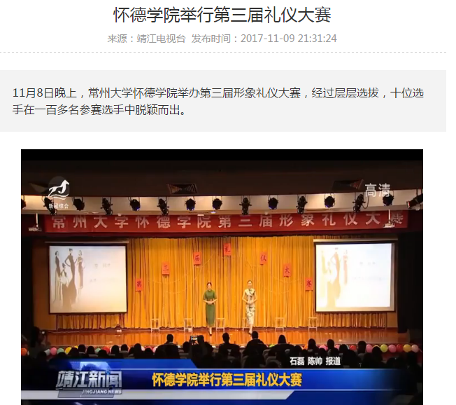 11月8日晚上,常州大学怀德学院举办第三届形象礼仪大赛,经过层层选拔,十位选手在一百多名参赛选手中脱颖而出。在礼仪形象展示环节,选手以旗袍亮相,展示中国国粹的古典魅力。在情景模拟环节,选手表演了古代学堂、婚礼和现代相亲、面试等社交礼仪,以端庄大方的形象展示了大学生的精神面貌。
