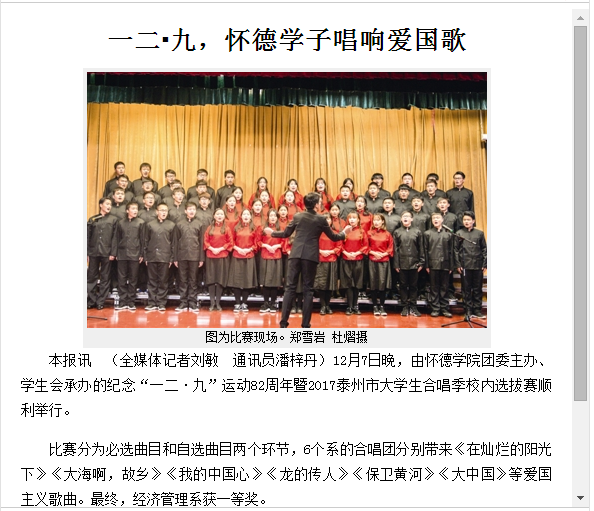 本报讯 (全媒体记者刘敏 通讯员潘梓丹)12月7日晚,由怀德学院团委主办、学生会承办的纪念“一二·九”运动82周年暨2017泰州市大学生合唱季校内选拔赛顺利举行。