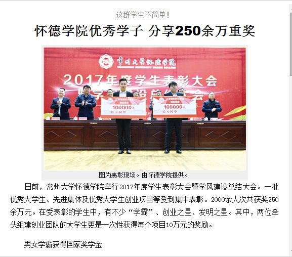 日前,常州大学怀德学院举行2017年度学生表彰大会暨学风建设总结大会。一批优秀大学生、先进集体及优秀大学生创业项目等受到集中表彰。2000余人次共获奖250余万元。在受表彰的学生中,有不少“学霸”、创业之星、发明之星。其中,两位牵头组建创业团队的大学生更是一次性获得每个项目10万元的奖励。