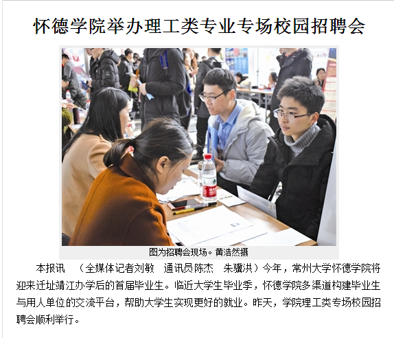 本报讯 (全媒体记者刘敏 通讯员陈杰 朱骥洪)今年,常州大学怀德学院将迎来迁址靖江办学后的首届毕业生。临近大学生毕业季,怀德学院多渠道构建毕业生与用人单位的交流平台,帮助大学生实现更好的就业。昨天,学院理工类专场校园招聘会顺利举行。