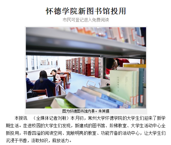 本报讯 (全媒体记者刘敏)本月初,常州大学怀德学院的大学生们迎来了新学期生活。走进校园的大学生们发现,新建成的图书馆、阶梯教室、大学生活动中心全新投用,书香四溢的阅读空间、宽敞明亮的教室、功能齐备的活动中心,让大学生们沉浸于书香,汲取知识,释放活力。