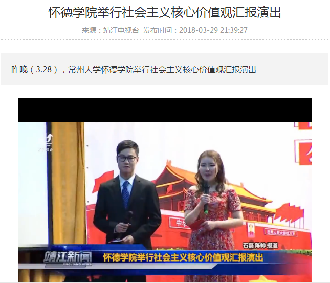 昨晚(3.28),常州大学怀德学院举行社会主义核心价值观汇报演出,演出以“奋进新时代,履行新使命,共筑伟大中国梦”为主题,包括小品、情景剧、朗诵、合唱等多形式的内容,表达了大学生对青春、对祖国的热爱,整场演出热情洋溢、积极向上。 常州大学怀德学院学生:主要是丰富同学们在校的日常文化活动,同时树立同学们的社会主义核心价值观,在同学之间树立争做“六有”青年的文化氛围。