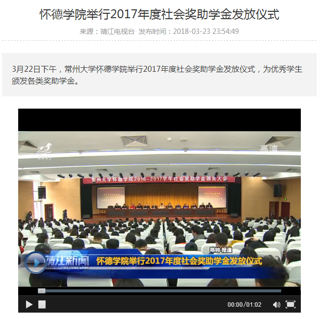 3月22日下午,常州大学怀德学院举行2017年度社会奖助学金发放仪式,为优秀学生颁发各类奖助学金。此次颁发的奖助学金包括新港城南京银行奖助学金、广宇奖助学金、迈能奖学金等八项奖助学金,全院共有359人获奖,颁发总金额65万元。