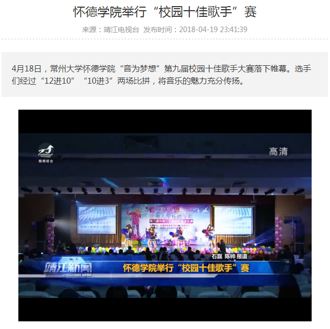 4月18日,常州大学怀德学院“音为梦想”第九届校园十佳歌手大赛落下帷幕。选手们经过“12进10”“10进3”两场比拼,将音乐的魅力充分传扬。