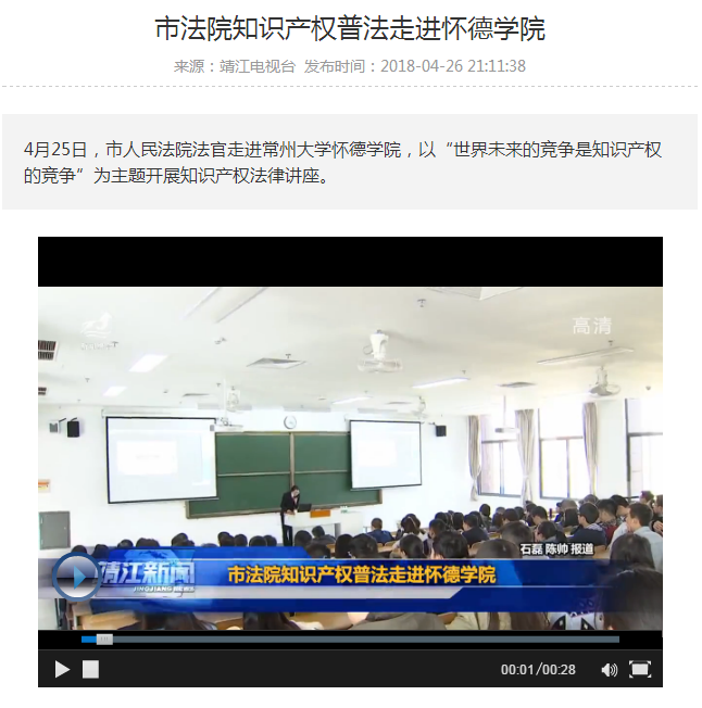 4月25日,市人民法院法官走进常州大学怀德学院,以“世界未来的竞争是知识产权的竞争”为主题开展知识产权法律讲座。法官以当下一款热门游戏的“正版授权logo”为切入点引出主题,并列举部分真实案例,围绕“商标侵权几种常见的表现形式”“有可能存在侵权的一些行为”等相关话题展开讲座,让同学们大家对《知识产权法》有了一定的基础认识。