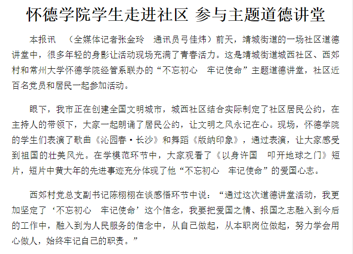 本报讯 (全媒体记者张金玲通讯员弓佳炜) 前天,靖城街道的一场社区道德讲堂中,很多年轻的身影让活动现场充满了青春活力。这是靖城街道城西社区、西郊村和常州大学怀德学院经管系联办的“不忘初心 牢记使命”主题道德讲堂,社区近百名党员和居民一起参加活动。