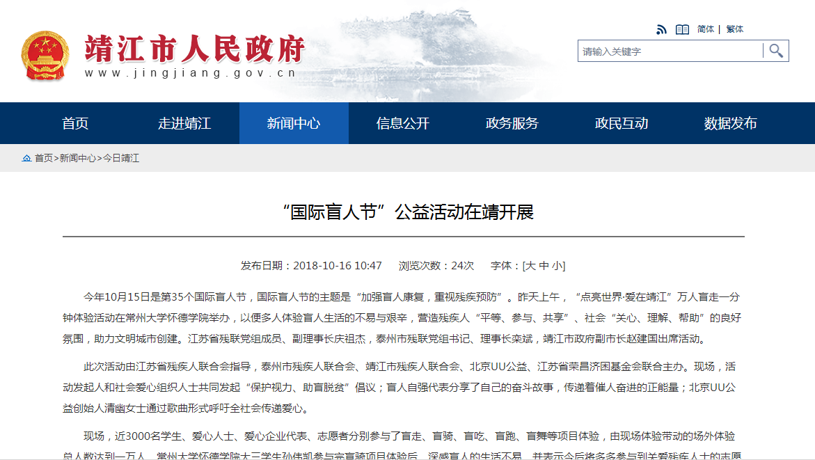 此次活动由江苏省残疾人联合会指导,泰州市残疾人联合会、靖江市残疾人联合会、北京UU公益、江苏省荣昌济困基金会联合主办。现场,活动发起人和社会爱心组织人士共同发起“保护视力、助盲脱贫”倡议;盲人自强代表分享了自己的奋斗故事,传递着催人奋进的正能量;北京UU公益创始人清幽女士通过歌曲形式呼吁全社会传递爱心。
