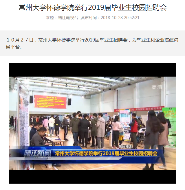 10月27日,常州大学怀德学院举行2019届毕业生招聘会,为毕业生和企业搭建沟通平台。招聘会现场,150家企业公开招募3000多个岗位,除了靖江的本土企业,还有来自常州、苏州等周边城市的知名企业,招聘会吸引了全院2100多名2019届毕业生前来应聘。
