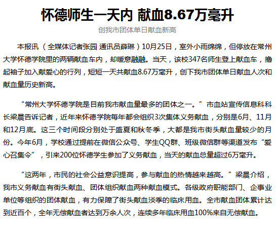 本报讯 (全媒体记者张园 通讯员薛琳)10月25日,室外小雨绵绵,但停放在常州大学怀德学院里的两辆献血车内,却暖意融融。当天,该校347名师生登上献血车,撸起袖子加入献爱心的行列,短短一天共献血8.67万毫升,创下我市团体单日献血人次和献血量历史新高。