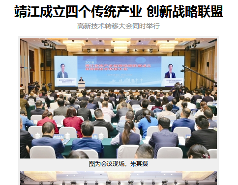 本报讯 (全媒体记者周俊见习记者严智勇 特约记者王跃军)10月16日,靖江传统产业创新战略联盟成立暨高新技术转移大会举行,来自全国高校院所的科技界领导、知名专家,与靖江企业共同谋划推动传统产业向高端攀升、向高质量发展进军。市委书记赵叶出席大会并致辞。他希望更加自觉地推动企业家与科学家的结对、新智能与新制造的共享、创新力和竞争力的融合,加快做大做强优势特色产业。