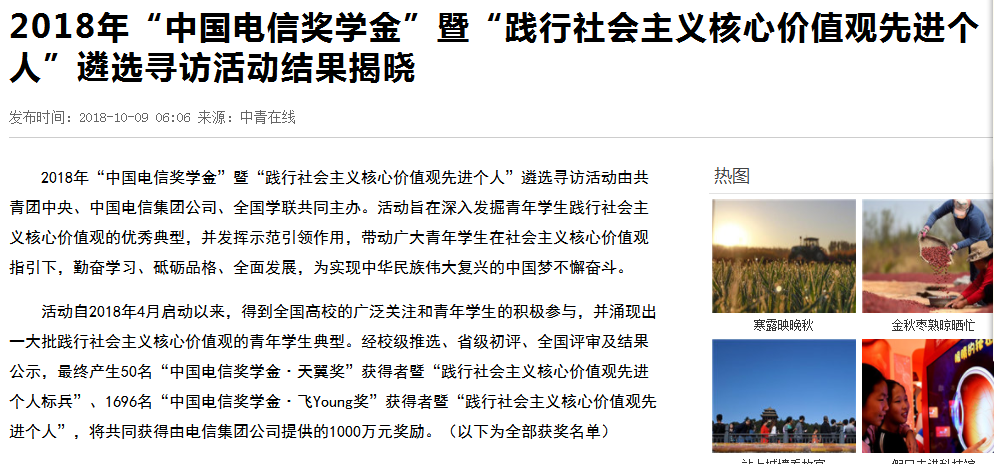 2018年“中国电信奖学金”暨“践行社会主义核心价值观先进个人”遴选寻访活动由共青团中央、中国电信集团公司、全国学联共同主办。活动旨在深入发掘青年学生践行社会主义核心价值观的优秀典型,并发挥示范引领作用,带动广大青年学生在社会主义核心价值观指引下,勤奋学习、砥砺品格、全面发展,为实现中华民族伟大复兴的中国梦不懈奋斗。