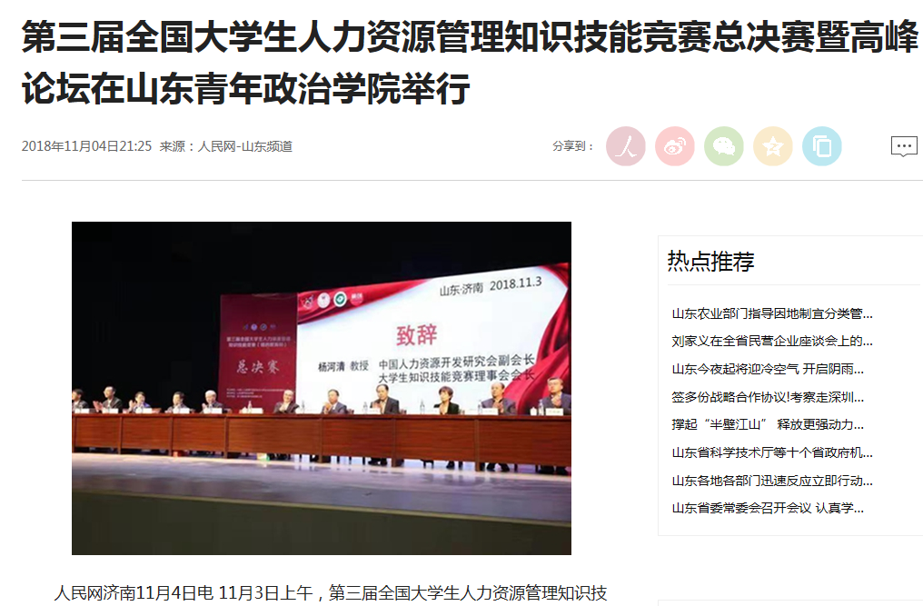 本次在山东青年政治学院举行的第三届全国大学生人力资源管理知识技能竞赛总决赛(精创教育杯)暨高峰论坛有效提升了学生的社会责任感、创新精神和专业技能,有效地推进人力资源管理专业的实践教学改革,提高人才培养质量,为全国各高校提供了专业交流平台。(赵健)
