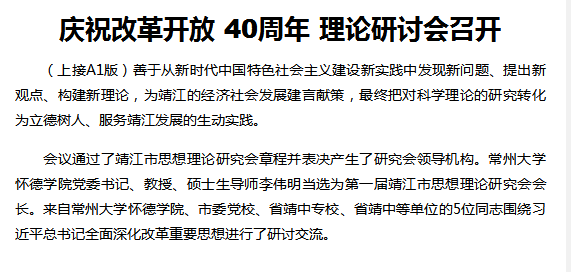 (上接A1版)善于从新时代中国特色社会主义建设新实践中发现新问题、提出新观点、构建新理论,为靖江的经济社会发展建言献策,最终把对科学理论的研究转化为立德树人、服务靖江发展的生动实践。