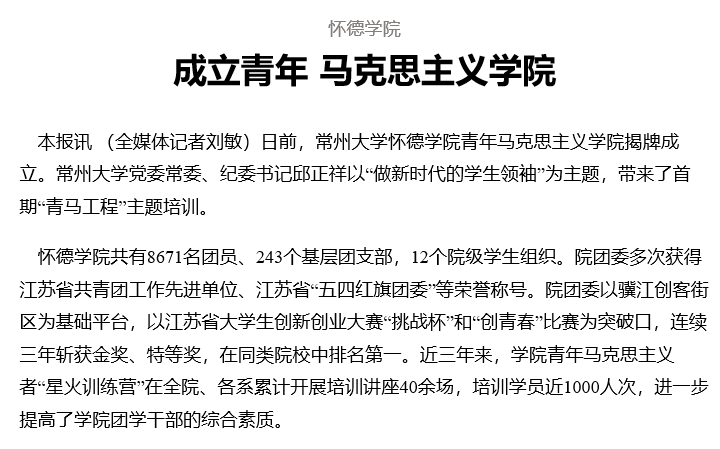 本报讯 (全媒体记者刘敏)日前,常州大学怀德学院青年马克思主义学院揭牌成立。常州大学党委常委、纪委书记邱正祥以“做新时代的学生领袖”为主题,带来了首期“青马工程”主题培训。