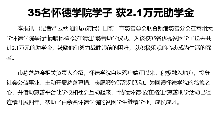 本报讯 (记者严云秋 通讯员靖民)日前,市慈善总会联合新港慈善分会在常州大学怀德学院举行“情暖怀德·爱在靖江”慈善助学仪式,为该校35名优秀贫困学子送去共计2.1万元的助学金,鼓励他们努力战胜眼前的困难,以积极乐观的心态成为生活的强者。