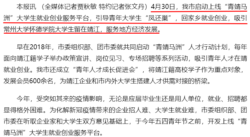 今年,受突如其来的疫情影响,无论是应届毕业生还是用人单位,就业、招聘都显得格外困难。为化解新冠肺炎疫情带来的企业招人难、大学生就业难,市委组织部、团市委在听取企业家和大学生双方意见基础上,于今年五四青年节之前,开发上线“青靖马洲”大学生就业创业服务平台。
