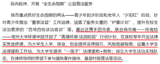 我市重点抓好生命周期的两头——青少年起步阶段和老年人“夕阳红”阶段,针对青少年推出“童享法益”工作品牌,涵盖了服务女童的“护蕾计划”、提升在校生法治素质的“百场百校法治宣讲”等。最近还携手团市委,联合我市唯一一所高校——常州大学怀德学院开启了“青靖怀德·法润校园”行动计划,在该校常年开设法律实务选修课,为大学生入学、就业、创业提供法律指引、风险规避指南;设置大学生法律援助工作站,为大学生提供“一揽子”法律援助+帮助;成立大学生法治实践队伍,在律师导师的带领下参与援助案件接待、基层村居普法等活动。