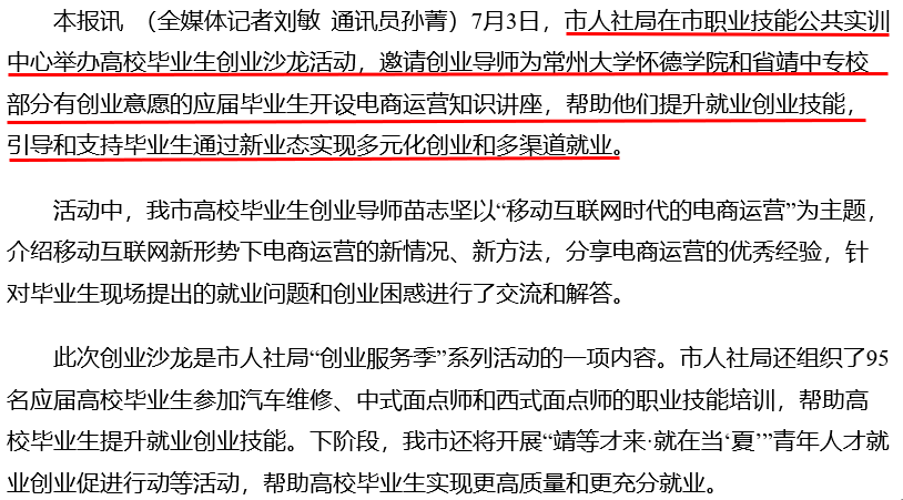 本报讯 (全媒体记者刘敏 通讯员孙菁)7月3日,市人社局在市职业技能公共实训中心举办高校毕业生创业沙龙活动,邀请创业导师为常州大学怀德学院和省靖中专校部分有创业意愿的应届毕业生开设电商运营知识讲座,帮助他们提升就业创业技能,引导和支持毕业生通过新业态实现多元化创业和多渠道就业。