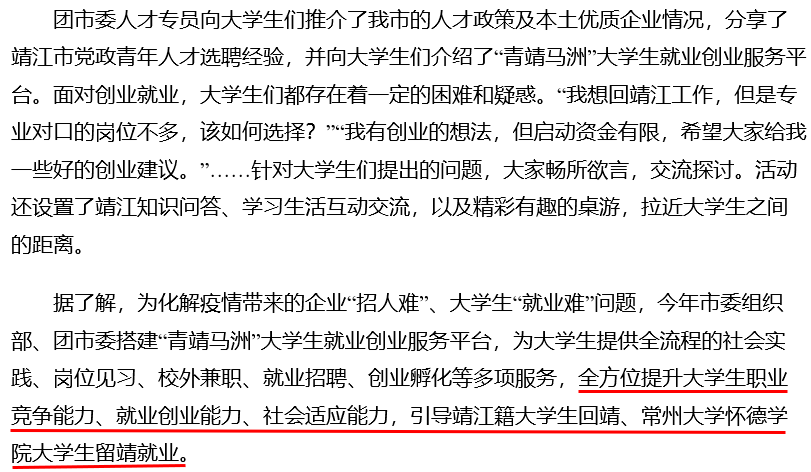 据了解,为化解疫情带来的企业“招人难”、大学生“就业难”问题,今年市委组织部、团市委搭建“青靖马洲”大学生就业创业服务平台,为大学生提供全流程的社会实践、岗位见习、校外兼职、就业招聘、创业孵化等多项服务,全方位提升大学生职业竞争能力、就业创业能力、社会适应能力,引导靖江籍大学生回靖、常州大学怀德学院大学生留靖就业。