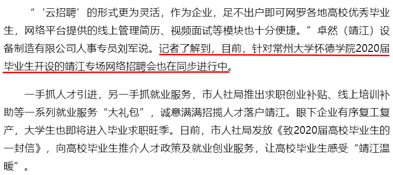 “‘云招聘’的形式更为灵活,作为企业,足不出户即可网罗各地高校优秀毕业生,网络平台提供的线上管理简历、视频面试等模块也十分便捷。”卓然(靖江)设备制造有限公司人事专员刘军说。记者了解到,目前,针对常州大学怀德学院2020届毕业生开设的靖江专场网络招聘会也在同步进行中。