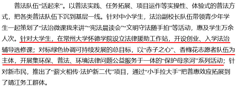 普法队伍“活起来”。以普法实践、任务拓展、项目运作等实操性、体验式的普法方式,把各类普法队伍下沉到基层一线。针对中小学生,法治副校长队伍带领青少年学生一起策划了“法治微课我来讲”“宪法晨读会”“文明守法随手拍”等活动,惠及学生万余人次。针对大学生,在常州大学怀德学院设立法律援助工作站,开设创业、入学法治辅导选修课;对标绿色协调可持续发展的总目标,以“赤子之心”、香橼花志愿者队伍为主体,开展集环保、普法、环境法律问题公益服务于一体的“保护母亲河”系列活动;针对新市民,推出了“薪火相传·法护新二代”项目,通过“小手拉大手”把普惠效应拓展到了靖江务工群体。