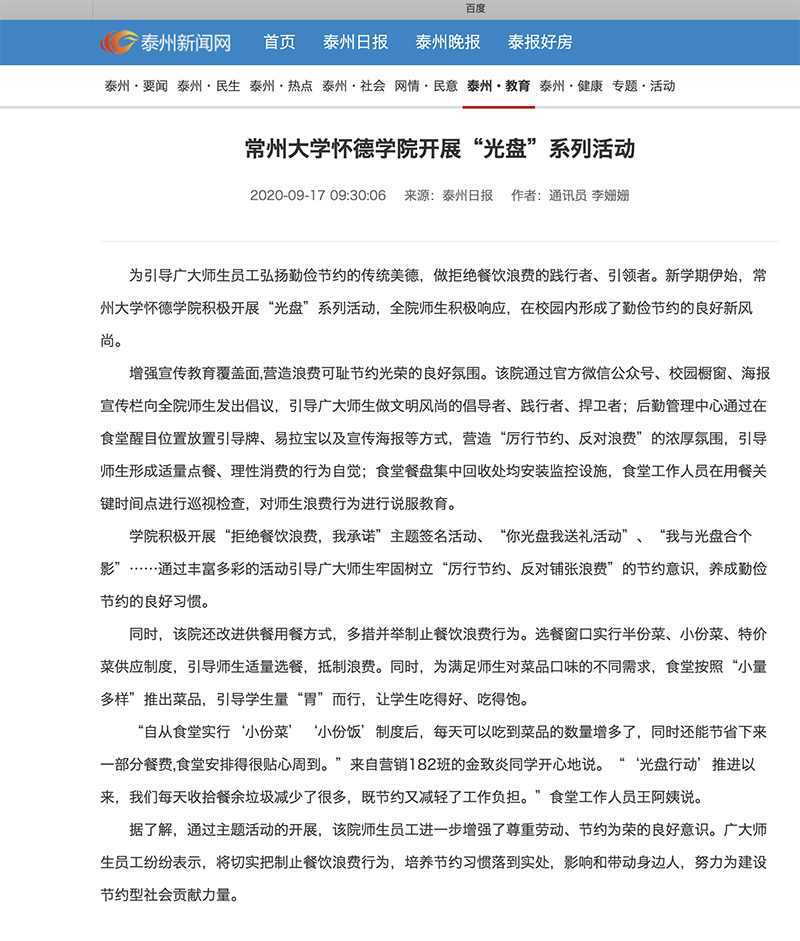 本报讯 (通讯员 李姗姗)新学期以来,常州大学怀德学院的大学生们走进食堂发现,不少窗口推出了“小份菜”“小份饭”。记者了解到,本学期,怀德学院积极开展“厉行节约,反对浪费”主题活动,通过校园环境打造、主题活动倡导、改进点餐制度等方式,引导广大师生员工弘扬勤俭节约传统美德,做拒绝餐饮浪费的践行者、引领者。