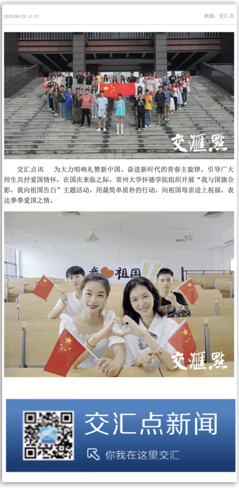 交汇点讯 为大力唱响礼赞新中国、奋进新时代的青春主旋律,引导广大师生共抒爱国情怀,在国庆来临之际,常州大学怀德学院组织开展“我与国旗合影,我向祖国告白”主题活动,用最简单质朴的行动,向祖国母亲送上祝福,表达拳拳爱国之情。