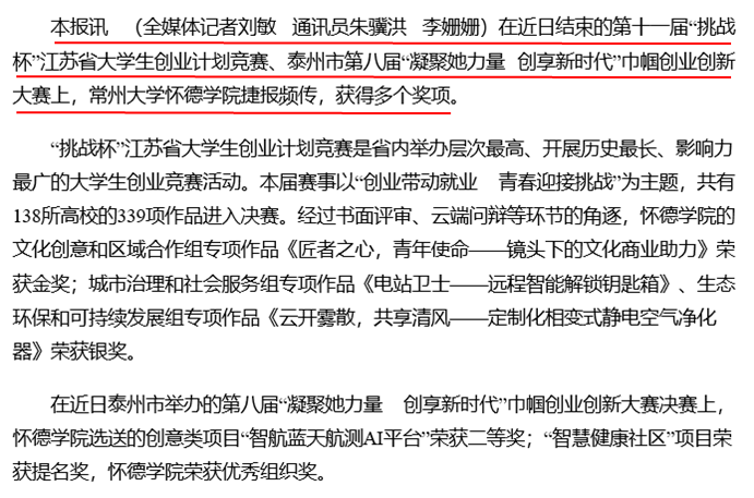 本报讯 (全媒体记者刘敏 通讯员朱骥洪 李姗姗)在近日结束的第十一届“挑战杯”江苏省大学生创业计划竞赛、泰州市第八届“凝聚她力量 创享新时代”巾帼创业创新大赛上,常州大学怀德学院捷报频传,获得多个奖项。
