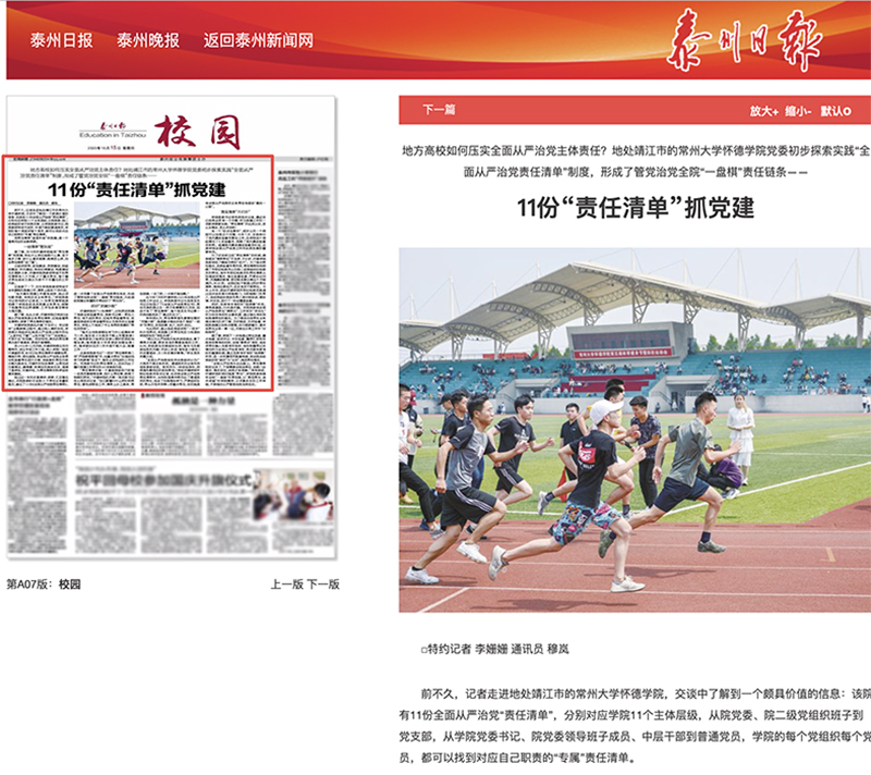 前不久,记者走进地处靖江市的常州大学怀德学院,交谈中了解到一个颇具价值的信息:该院有11份全面从严治党“责任清单”,分别对应学院11个主体层级,从院党委、院二级党组织班子到党支部,从学院党委书记、院党委领导班子成员、中层干部到普通党员,学院的每个党组织每个党员,都可以找到对应自己职责的“专属”责任清单。