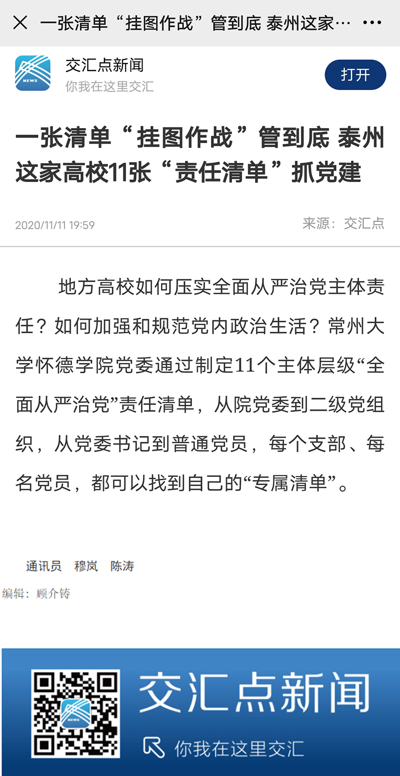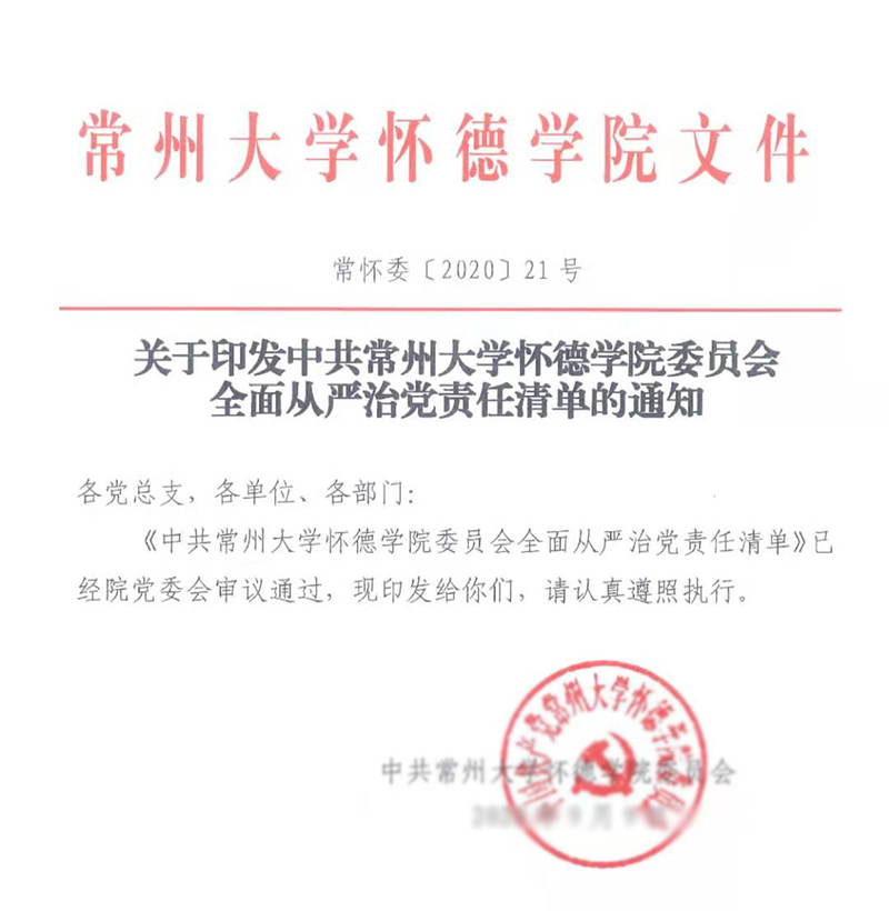地方高校如何压实全面从严治党主体责任?如何加强和规范党内政治生活?常州大学怀德学院党委通过制定11个主体层级“全面从严治党”责任清单,从院党委到二级党组织,从党委书记到普通党员,每个支部、每名党员,都可以找到自己的“专属清单”。
