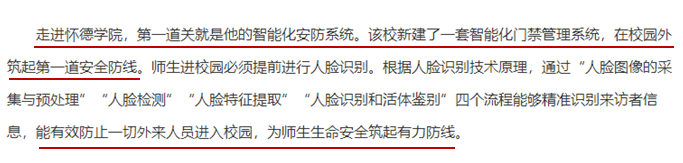 走进怀德学院,第一道关就是他的智能化安防系统。该校新建了一套智能化门禁管理系统,在校园外筑起第一道安全防线。师生进校园必须提前进行人脸识别。根据人脸识别技术原理,通过“人脸图像的采集与预处理”“人脸检测”“人脸特征提取”“人脸识别和活体鉴别”四个流程能够精准识别来访者信息,能有效防止一切外来人员进入校园,为师生生命安全筑起有力防线。
