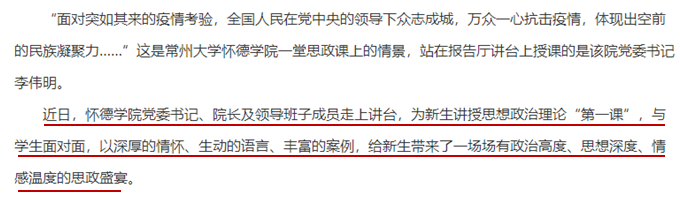 “面对突如其来的疫情考验,全国人民在党中央的领导下众志成城,万众一心抗击疫情,体现出空前的民族凝聚力……”这是常州大学怀德学院一堂思政课上的情景,站在报告厅讲台上授课的是该院党委书记李伟明。