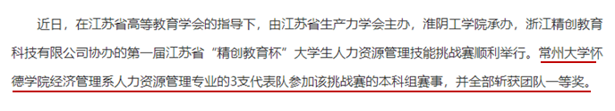 近日,在江苏省高等教育学会的指导下,由江苏省生产力学会主办,淮阴工学院承办,浙江精创教育科技有限公司协办的第一届江苏省“精创教育杯”大学生人力资源管理技能挑战赛顺利举行。常州大学怀德学院经济管理系人力资源管理专业的3支代表队参加该挑战赛的本科组赛事,并全部斩获团队一等奖。