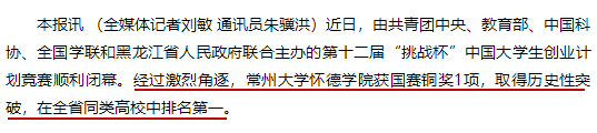 本报讯 (全媒体记者刘敏 通讯员朱骥洪)近日,由共青团中央、教育部、中国科协、全国学联和黑龙江省人民政府联合主办的第十二届“挑战杯”中国大学生创业计划竞赛顺利闭幕。经过激烈角逐,常州大学怀德学院获国赛铜奖1项,取得历史性突破,在全省同类高校中排名第一。